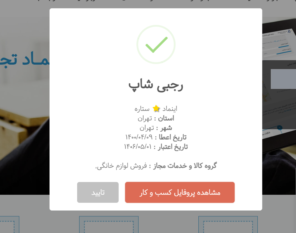در صورتی که اینماد ما فعال و دارای اعتبار باشد پاپ آپی به شکل زیر به شما نمایش داده میشود که با کلیک روی عبارت مشاهده پروفایل میتوانید از جزئیات پروفایل مانند آدرس و شماره تماس مطلع شوید.
