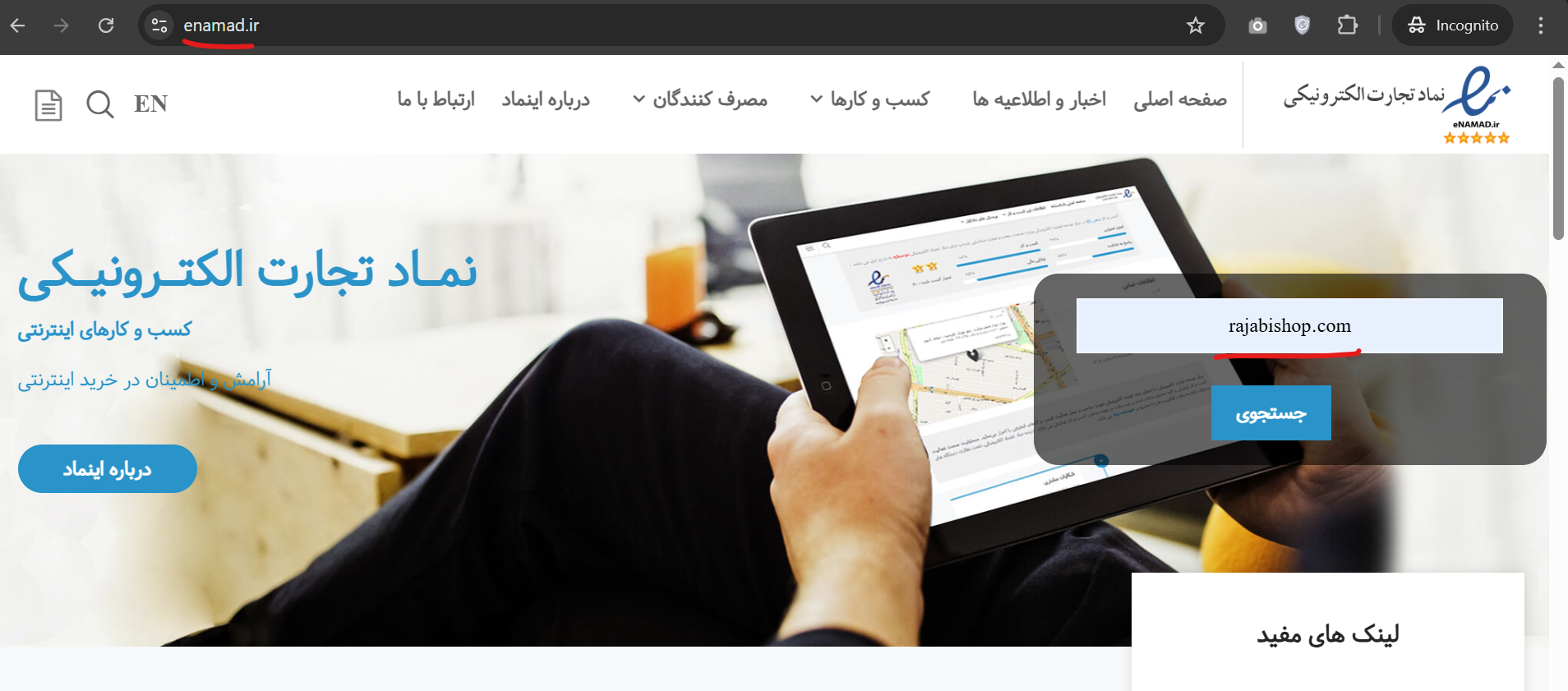 از طریق کلیک روی این لینک وارد وب سایت اینماد شوید، در باکس جستجو نام دامنه ما یعنی rajabishop.com را وارد کنید و سپس روی دکمه جستجو کلیک کنید.