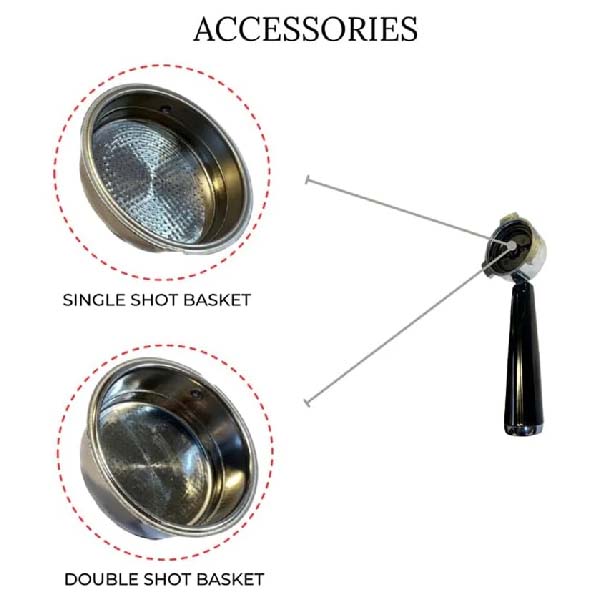 اقلام همراه شامل یک عدد پرتافیلتر، یک عدد بسکت تک، یک عدد بسکت دوبل، تمپر و پیمانه استیل میباشد.